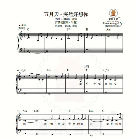 五月天 - 突然好想你(C調初階版 - 半首)_附前奏、歌詞、和弦