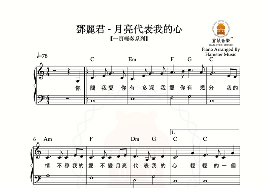 【一頁輕奏系列】鄧麗君 - 月亮代表我的心(附歌詞、和弦)