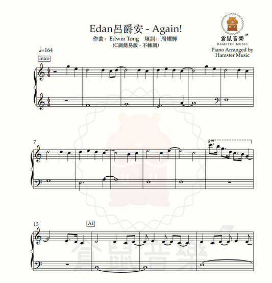 Edan呂爵安 - Again!(C調簡易版,不轉調)